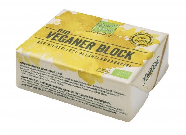 Landkrone Bio Veganer Block ist eine Dreiviertelfett-Pflanzenmargarine, die auf Brot schmeckt und zum Kochen und Backen geeignet ist. Der Bio Vegane Block ist palmölfrei. Neu: Verpackt im Papiereinwickler