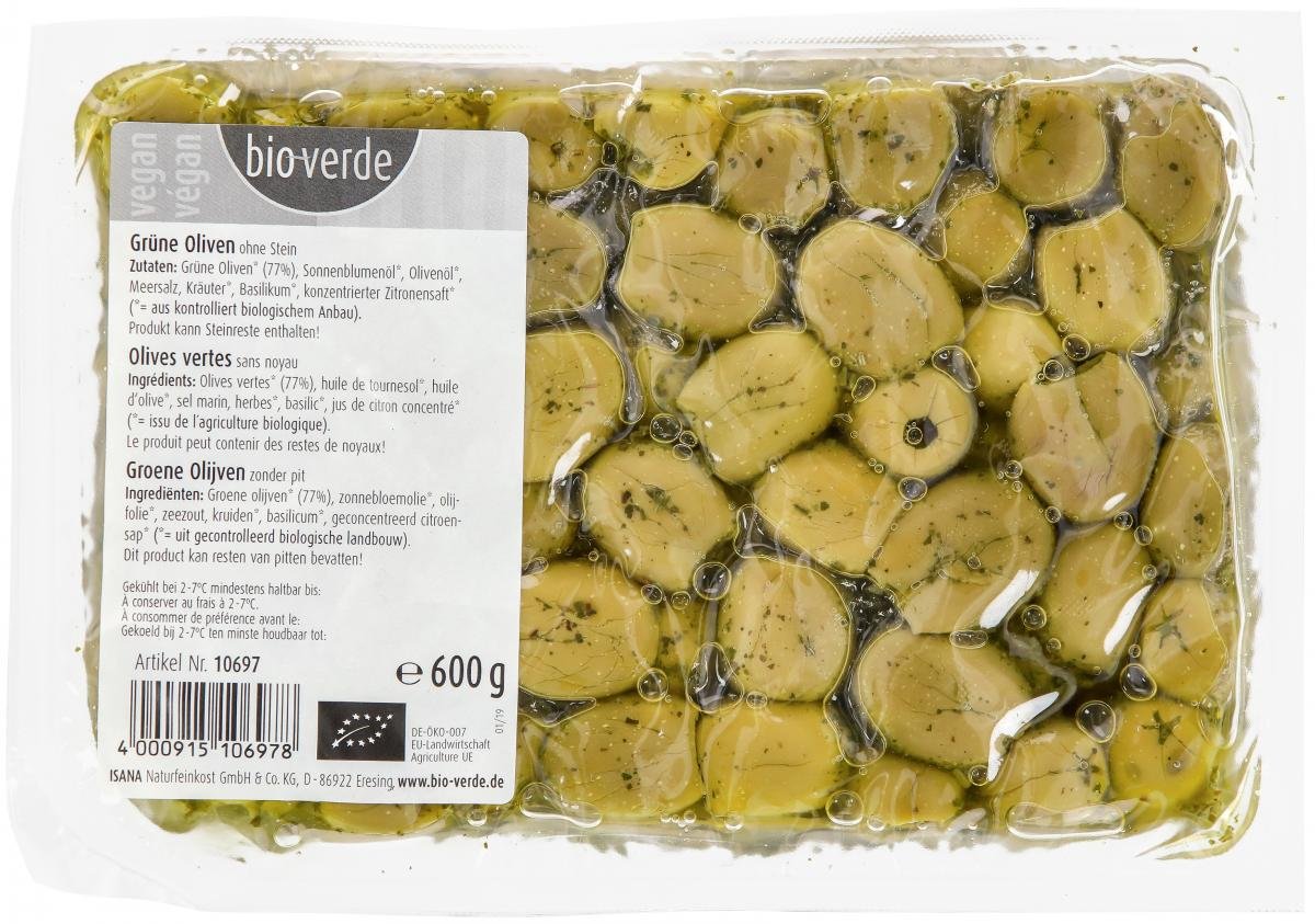 Grüne Oliven* (89%), Sonnenblumenöl*, Meersalz, Olivenöl*, Kräuter*, Basilikum*, konzentrierter Zitronensaft*