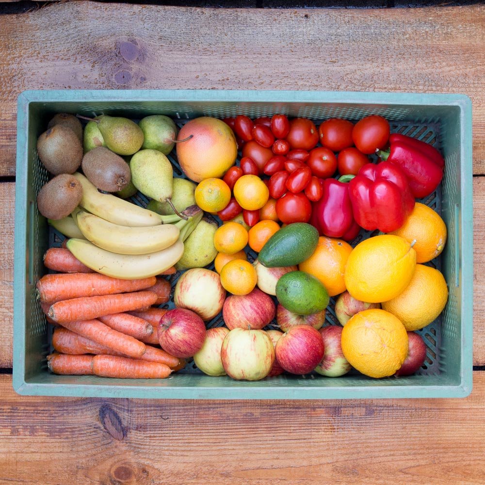 Immer enthalten: Bananen, Äpfel, Möhren, Cherrytomaten, Gurke sowie ein weiteres Gemüse wie Kohlrabi, Radieschen oder Paprika. Hinzu kommen 2-4 Sorten saisonales Obst wie z.B. Orangen, Kiwi, Birnen, Nektarinen, Erdbeeren, Heidelbeeren, Trauben, Melonen.